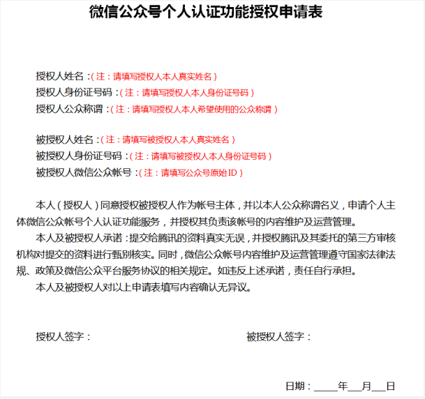 本人XX(授權人真實姓名),身份證號碼XXX(授權人身份證號碼),確認并授權XXXX(帳號主體名稱,也即被授權人真實姓名),身份證號碼XXXX(被授權人身份證號碼),作為帳號主體,以本人公眾稱謂“XXXX”名義,申請個人類型微信公眾帳號個人認證功能服務,并運營此公眾號。